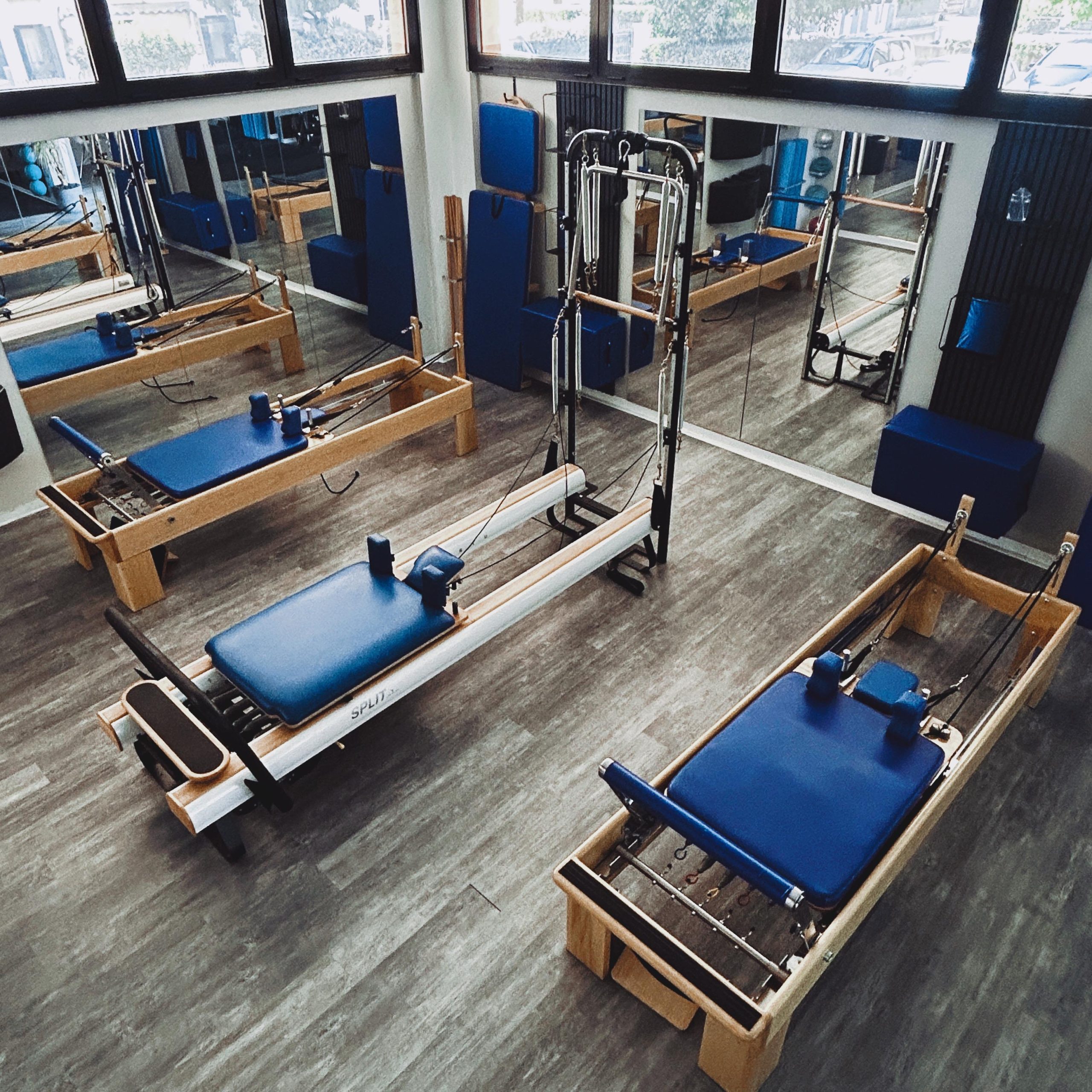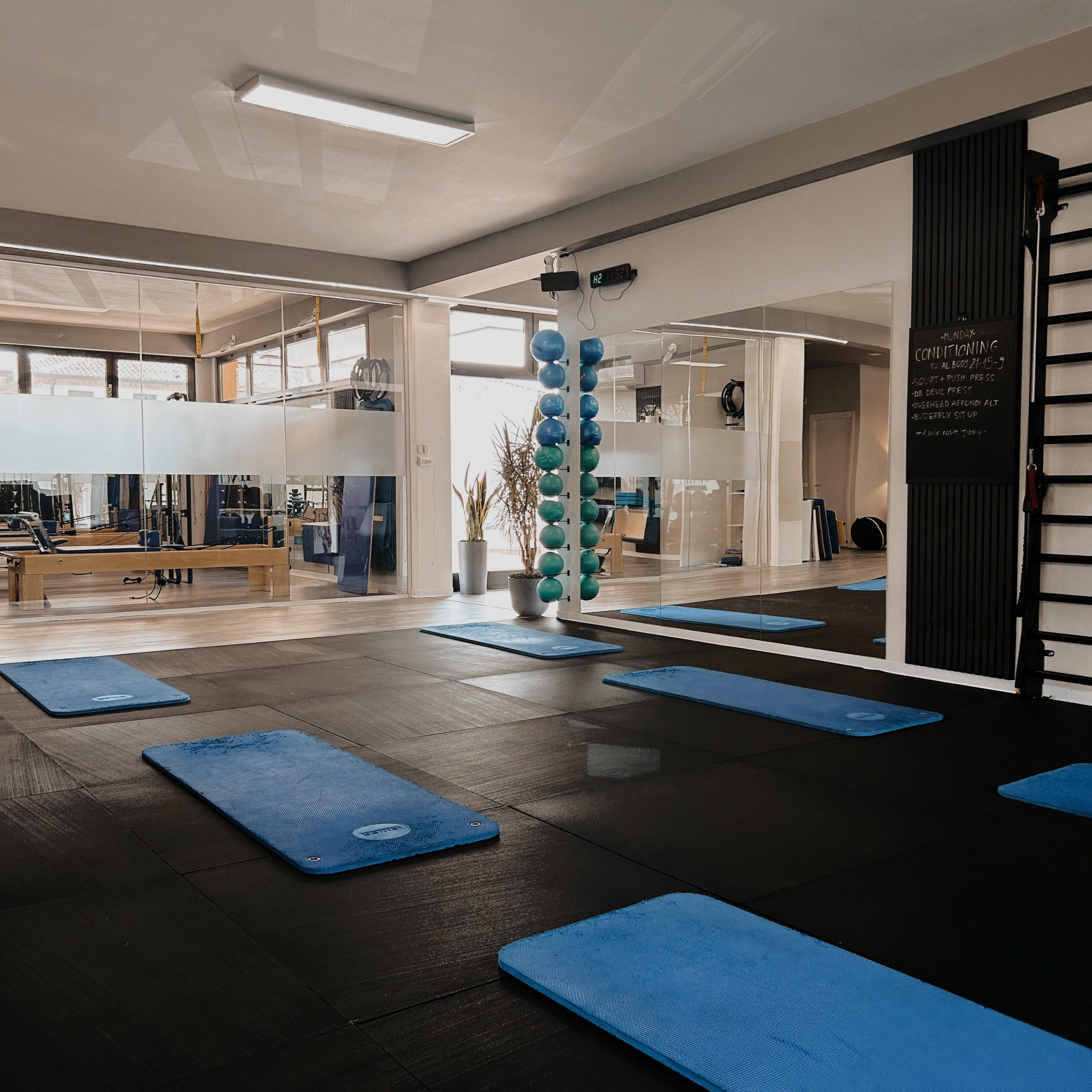Sala adibita all’attività di Reformer Pilates. Le lezioni si svolgono in gruppi composti da 3 persone, dalla durata di 55 minuti.